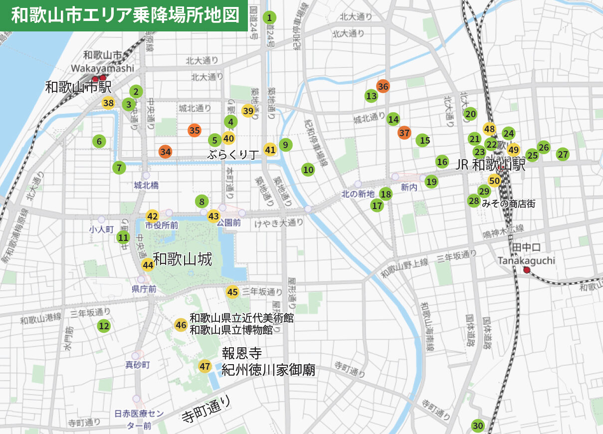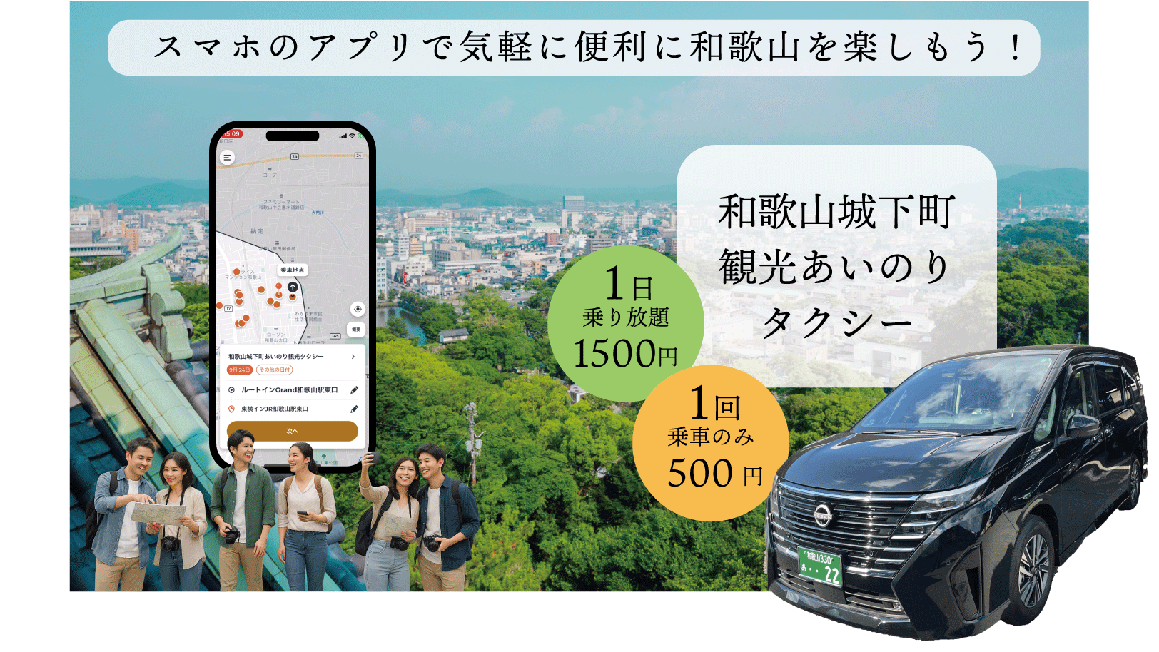 スマートフォンから簡単にタクシーを呼びだせる相乗りタクシーという移動サービスです。和歌山市内の47か所に設けられた乗降ポイントを自由に行き来でき、観光スポット巡りや食べ歩き、日常のお出かけにも便利にご利用いただけます。